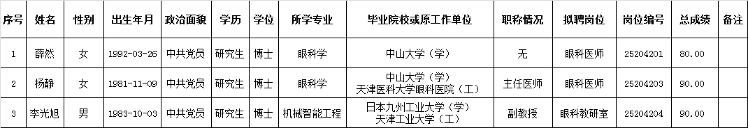 天津医科大学眼科医院2025年第二批公开招聘拟聘用人员公示表
